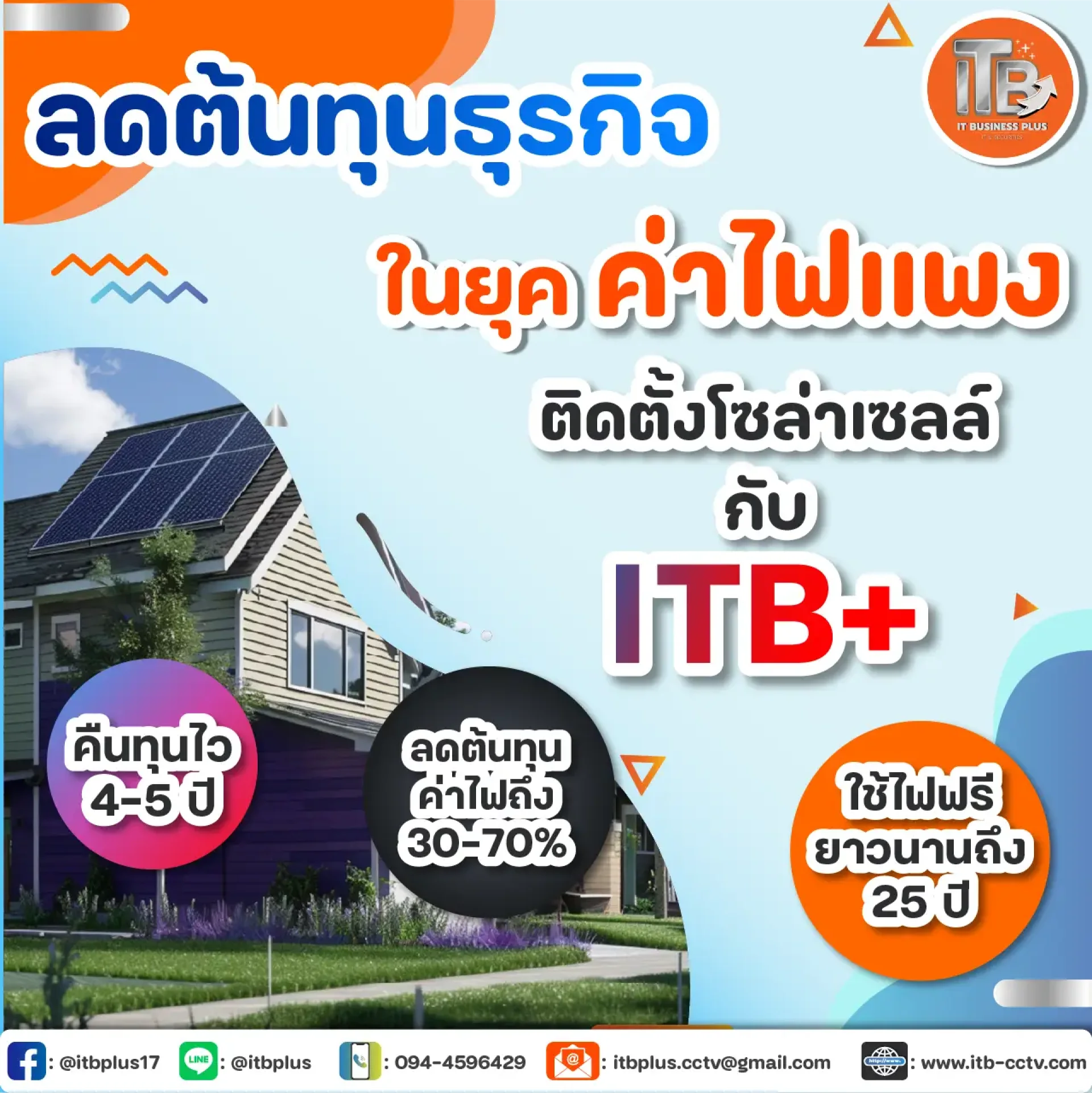 ติดก่อนคุ้มก่อนนะคะ ITb+ เรายินดีให้คำปรึกษา ไม่ว่าจะเป็นเรื่องการเลือกแผงโซลาร์เซลล์ ขนาดที่เหมาะสมกับการใช้งาน หรือการติดตั้งระบบพลังงานแสงอาทิตย์ค่ะ