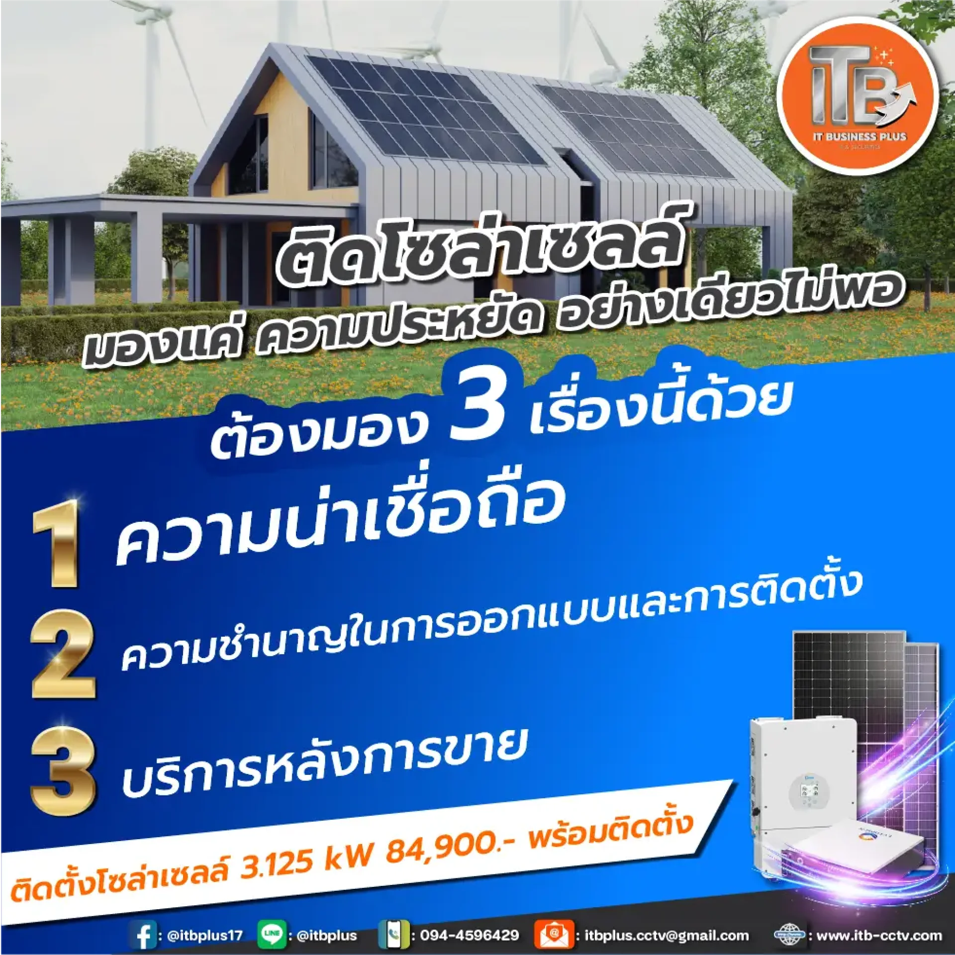 ITb+ เรายินดีให้คำปรึกษา ไม่ว่าจะเป็นเรื่องการเลือกแผงโซลาร์เซลล์ ขนาดที่เหมาะสมกับการใช้งาน หรือการติดตั้งระบบพลังงานแสงอาทิตย์ค่ะ